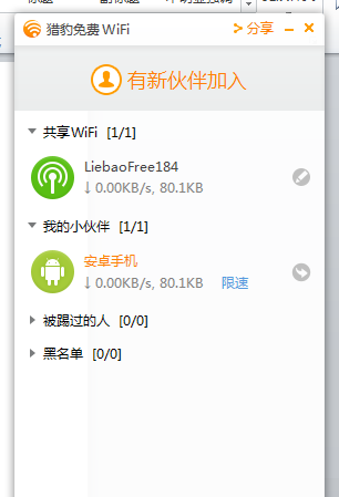3、点击 管理小伙伴,可以对连接的用户进行 限速,和关闭等操作,如WinWin7分享的图片: