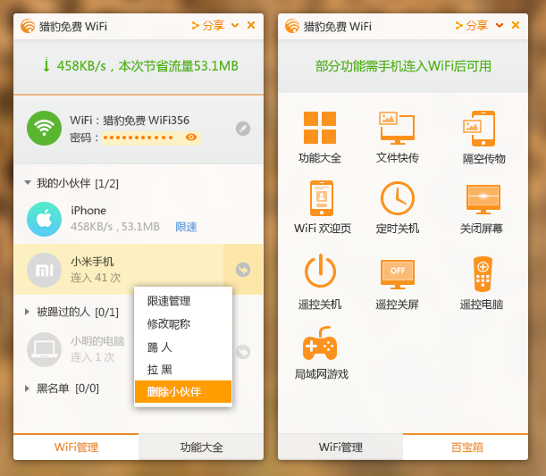 猎豹免费wifi是一款可以做出WiFi共享功能的校园网客户端方面做了进一步的支持电脑软件,在电脑上安装猎豹免费wifi后可以让你的笔记本变成一个无线路由器,此时我们就可以免费使用WiFi!最重要的还是『猎豹免费WiFi校园神器』在校园网客户端支持率上的进步!专为wifi而生!
