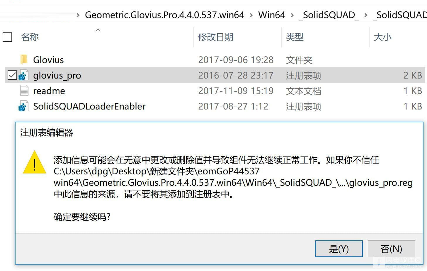 6.运行“glovius_pro.reg”并确认将信息添加到Windows注册表中,如下图所示: