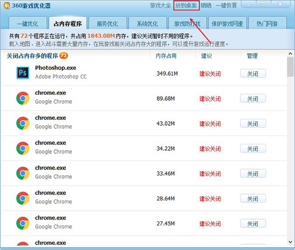 玩游戏时将获得更多CPU、内存资源、延迟更小360游戏优化器怎么放在屏幕上打开软件,点击上方的放在桌面;