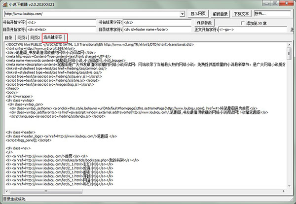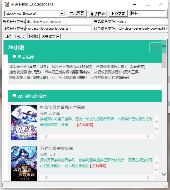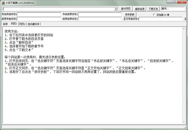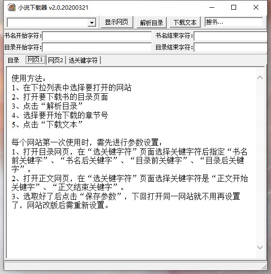 1、打开目录网页,在“选关键字符”页面选择关键字符后指定“书名前关键字”、“书名后关键字”、“目录前关键字”、“目录后关键字”。