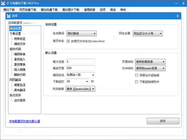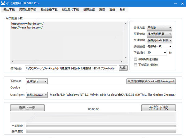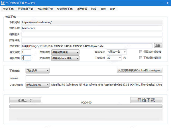 2、设置最大深度、最多页面和保存地址后,点击开始下载。