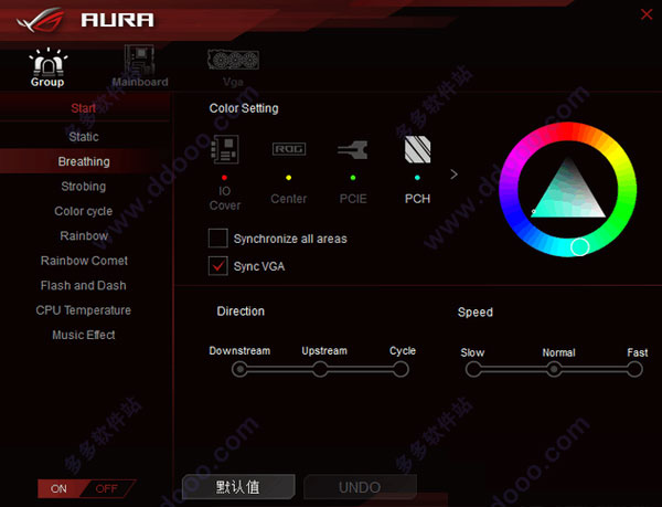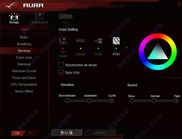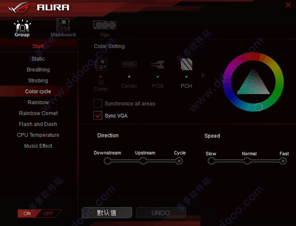 颜色循环(Color cycle)或者称为色相环,是一个直接设置全部区域的效果,不能设置速度和循环方向等参数。也是这款主板在默认情况下的光效。