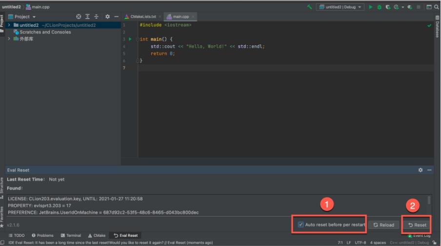7、直接将ide-eval-resetter-2.1.13.jar拖入主界面,重启即可。或者点击菜单【Help】->【Eval Reset】,勾选Auto reset before per restart,点击Reset,如下图所示: