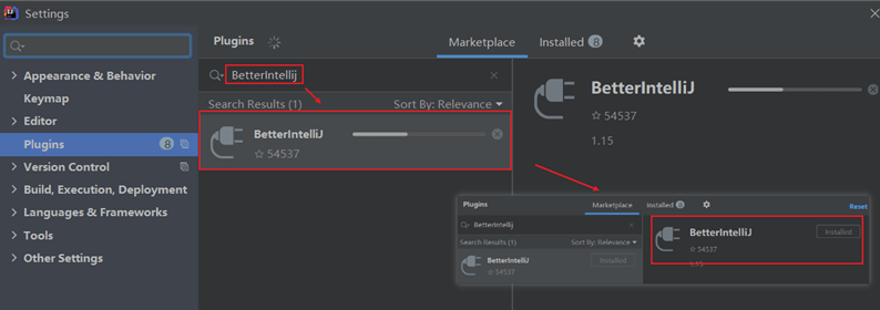 9、搜索 关键字 “BetterIntellij” 插件安装,如下图所示: