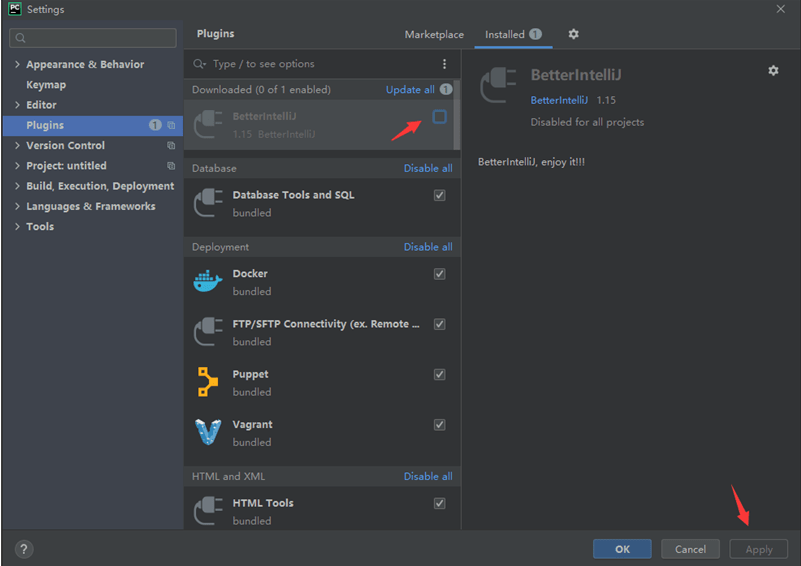 插件安装完之后,启用插件,并在右下角点击 apply。然后会弹出重启软件提示框,点击ok,然后重启clion,如下图所示: