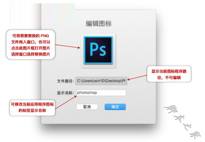 4、编写图标功能:跟上面一样按着随意图标等候一会就可以发生删掉按键,随后点击要想改动的图标就可以,会出现图标编写页面可自行改动显示图标和显示名字编写方法同上边编写图标功能,以后点击明确就可以,如发生名字反复提醒换一个名字就可以(不能改动日历,都不可以将别的图标改动成“日历”名字),发生变更不成功提醒一般是程序在c盘或是权限不足造成,用管理员模式或是把程序放到别的盘就可以;