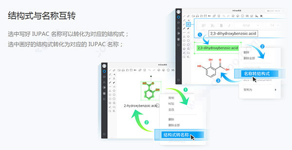 选中写好 IUPAC 名称可以转化为对应的结构式;选中画好的结构式转化为对应的 IUPAC 名称。