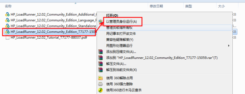 2.右键点击HP_LoadRunner_12.02_Community_Edition_Standalone_Applications_T7177-15061.exe 安装程序,打开窗口中选择【以管理员身份运行】(若在Loadrunner安装完后直接点击运行有问题的话,可以采用此方式使用管理员身份尝试运行。曾经运行时有一些问题,采用管理员身份运行后问题就没了。所以建议采用此方式。),见下图所示: