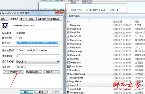 7、选中Modelsim SE 10.5,右键,双击打开软件安装位置,将crak破解文件夹中的MentorKG.exe、mgls.dll以及patch64_dll.bat复制到软件安装目录下的Win64文件夹内