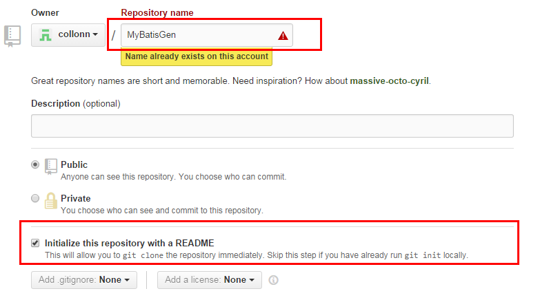 -->在github上点击create new, new repository, 随便输入一个项目名称即可,注意选上init this repository with readme(不选择也可以,事后再自己编辑),见下图所示: