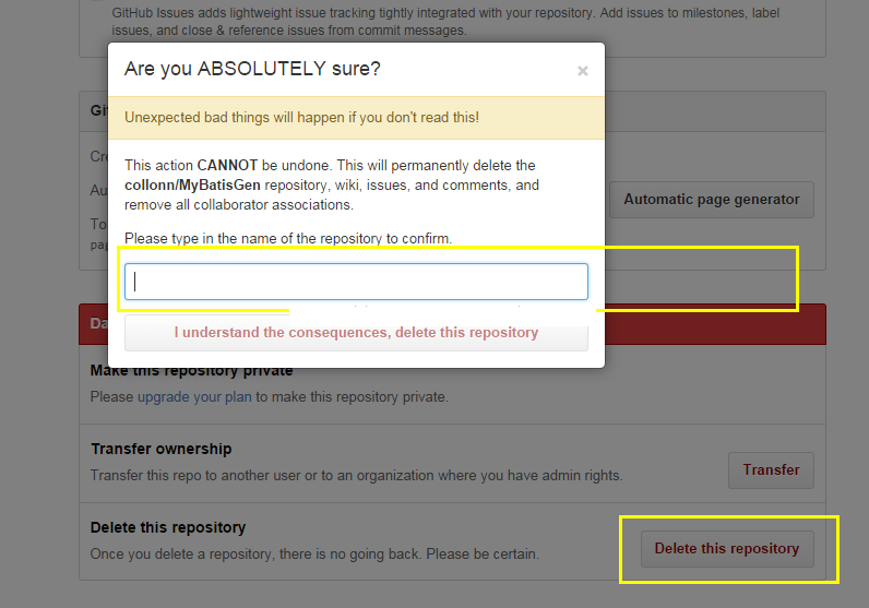 -->将页面拉到最下边,点击delete this repository,在弹出层中输入项目名称,点击删除即可,见下图所示: