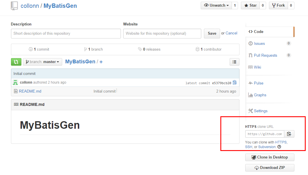 -->在本地随便一个目录下,输入以下命令,git clone https://github.com/collonn/MyBatisGen.git,(这里用了一个我的开源项目做为示例),