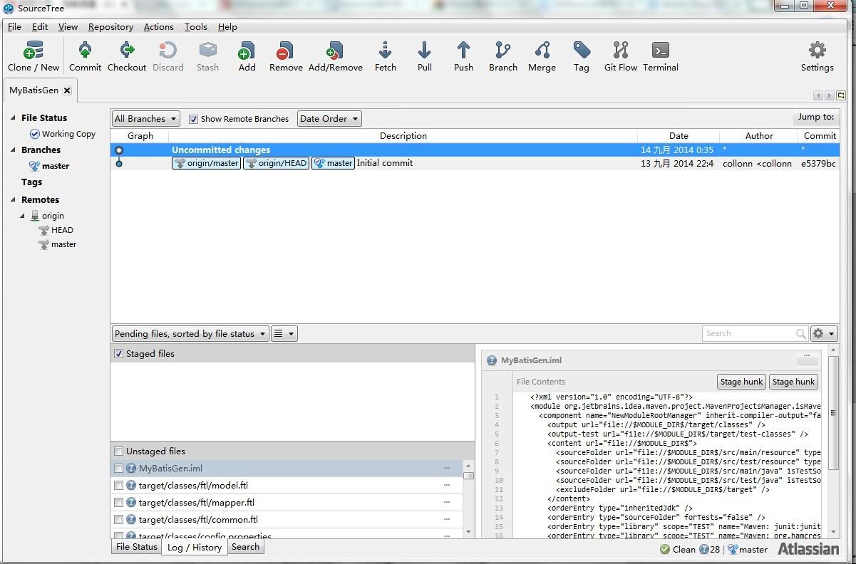 -->点击file-open,选择我们刚才clone出来的项目的根目录后,打开后,见下图所示:,可以看到,branches只有一个master, 点击右边的Uncommited changes,会显示你所有有改动但未提交的文件。