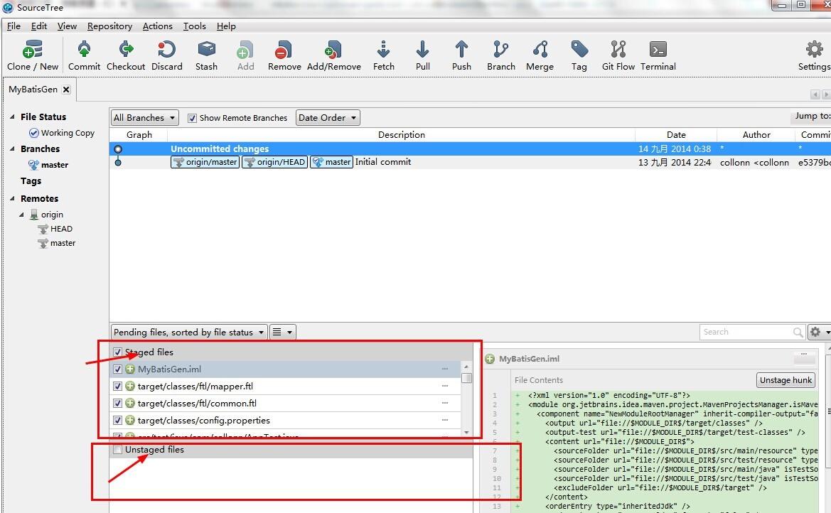 -->看Unstaged files这一块内容,我们按住shift,选择所有你要提交的文件,然后再点鼠标右键,选择add(意思就是add到本地的索引库),操作完成后,Staged files这块内容就会出现我们刚才选择的所有文件,见下图所示: