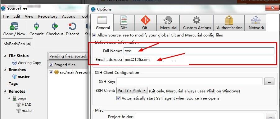 -->在我们提交到本地repo前,我们先在sourcetree中设置一下通用information,当commit到本地时,这个infomation会当做通用的提交信息,点击tool->options,在full name和email address中输入你的github账号信息,见下图所示: