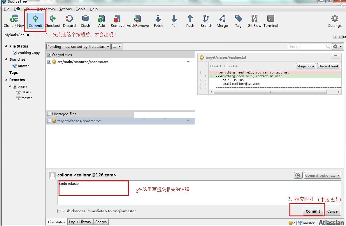 -->返回到我们刚才那一点,在Staged files中选择要提交到本地仓库的文件后,点击sourcetree左上角的commit之后,会让我们输入comments about this commit,输入后,点提交,可能会提示你再输入github的用户名和密码,见下图所示: