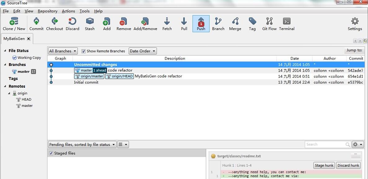 -->至此,我们只是提交到了本地仓库,最后一步就是如提交到远程仓库了,点击工具栏的push按钮,就可以提交到远程仓库(push到远程前,最好先从远程pull一把)。点击pull,即可从远程仓库下载最新的别人提交的修改了,见下图所示: