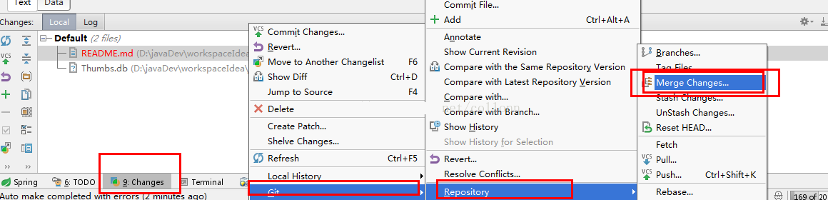 也可以在分支2上去过merge操作来获取其它分支的commit,但是要通过intellij idea去进行merge。