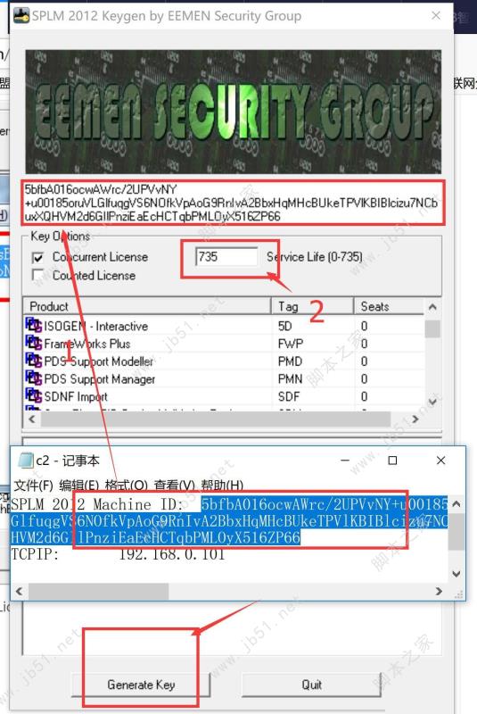 10.再次打开“Crack”目录,运行“Keygen.exe”,打开桌面刚生成c2.txt文本,根据图示将信息复制到注册机中,在图2中输入:735,然后点击左下角的“Generate Key”,见下图所示: