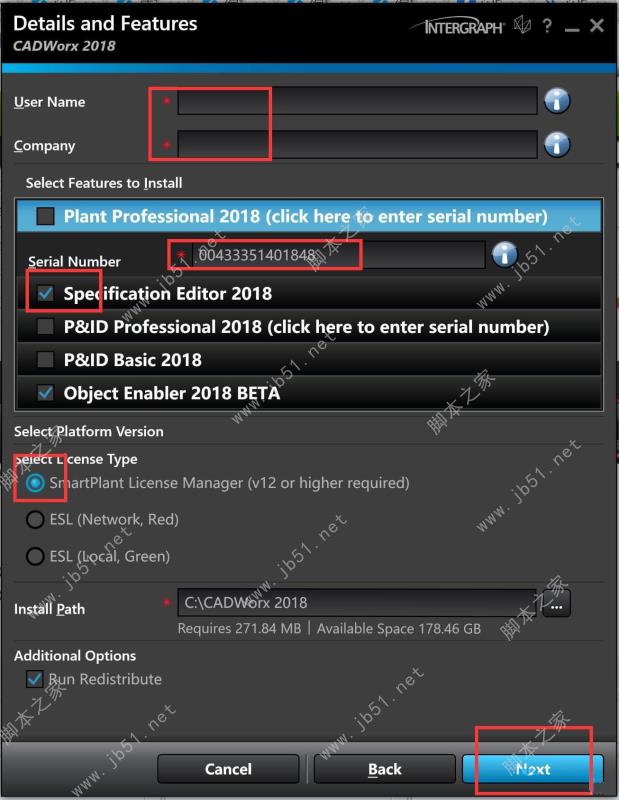 2.填写序列号,选择安装目录,,激活类型选择 smartplant license manager 点next继续安装,见下图所示:
