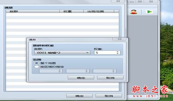 在敌群列表中双击出现遇敌设置窗口,敌群选择框选择敌群,权重:影响遭遇敌群出现的概率的数字。范围:自动遇敌的地图位置,整个地图或者指定区域。