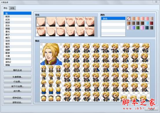 选择右边第二个工具开启人物生成窗口。在这里可以绘制你制作的游戏需要的人物,对人物的性别、面相、服饰、头像、行走图、战斗图、倒下图进行设置,也可以按随机生成按钮自动生成人物,按相应按钮保存到游戏相应的文件夹里面,在游戏制作中调用,如图: