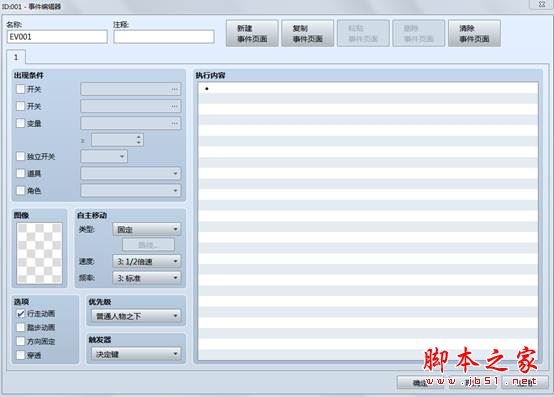 游戏中所有的事件指令都通过这个窗口进行操作。 在游戏运行的过程中如果要取消该事件:我通常使用独立开关操作,如上图在事件执行内容中独立开关a设置为on,新建事件页面,出现条件选择独立开关a,其他都不设置。