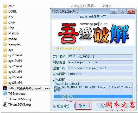 打开软件包中的t20v5.0全系列补丁,创建备份勾上,再点击修改即可破解,见winwin7分享的图片所示: