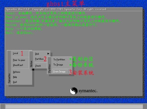 选择Local—Patition—FromImage,(注意,如果你选择Disk进行操作的话将对整个磁盘恢复)然后用Tab键选择你存放***.GHO文件的分区并找到GHO文件(注意,这里的分区并不是按以往你所见的分区排布,仔细找,别搞错了,而且有很多乱码的)选择好GHO文件后一路YES,(在选择GHOST恢复C盘时注意别选择到U盘上,看它们的容量可以辨别的。)然后就是等待,几分钟后你的系统又是崭新的了。