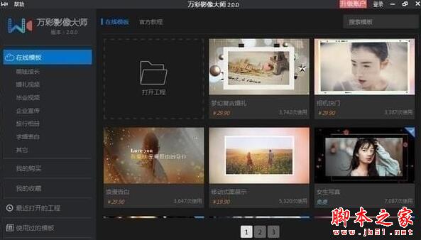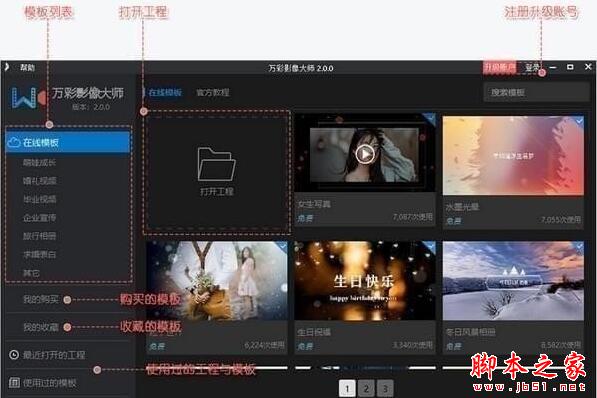 打开万彩影像大师, 您可打开工程文件, 打开模板, 收藏模板, 购买模板等。
