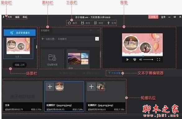 这里主要介绍万彩影像大师的3个主要界面, 包括初始界面, 主编辑界面和发布界面。