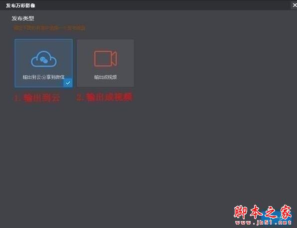 在发布界面, 您可以输出您的照片视频: 1.输出到云分享到微信。 2. 输出成视频。