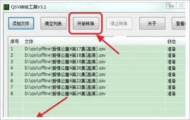 4、添加好需要转换的QSV之后,点击开始转换,之后等待转换为FLV格式文件即可;