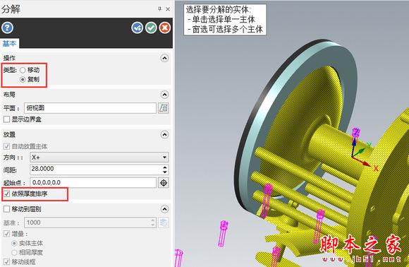 在分解之后可以将组件按厚度进行排列,选择排列的起始点及实时调整组件之间的距离。