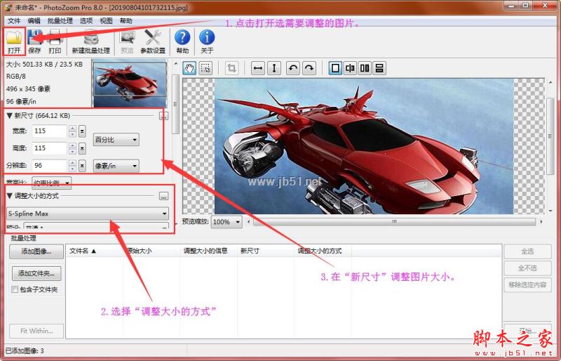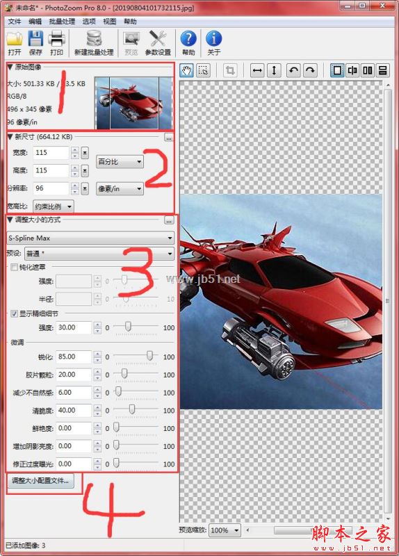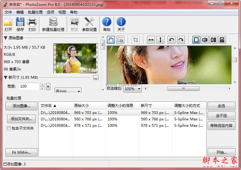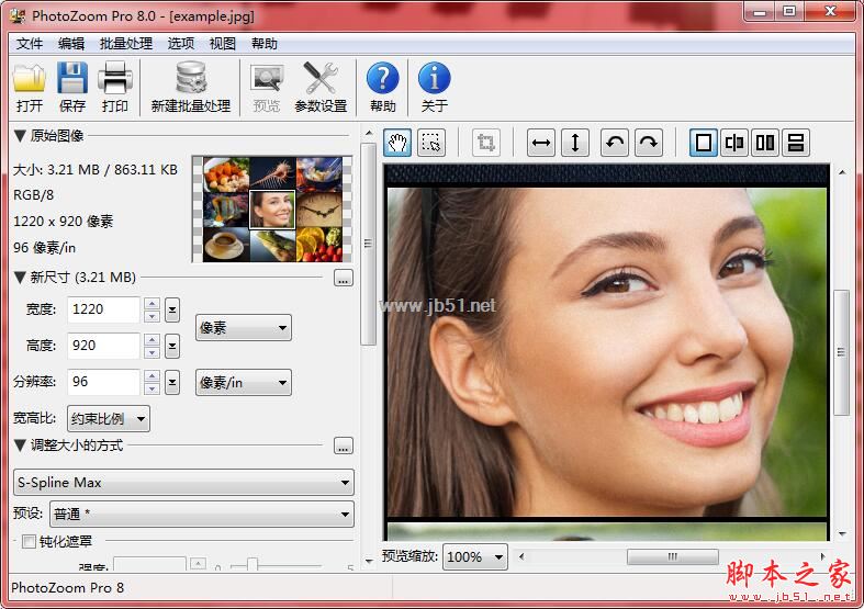 软件的使用很简单,打开一张图片后,首先选择「更改大小的方式」,默认是 S-Spline Max,然后在新尺寸框里输入新的图片尺寸即需要放大的尺寸,PhotoZoom Pro 就会自动调整图片了,感觉满意的话另存即可。