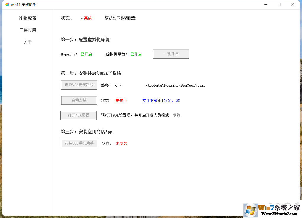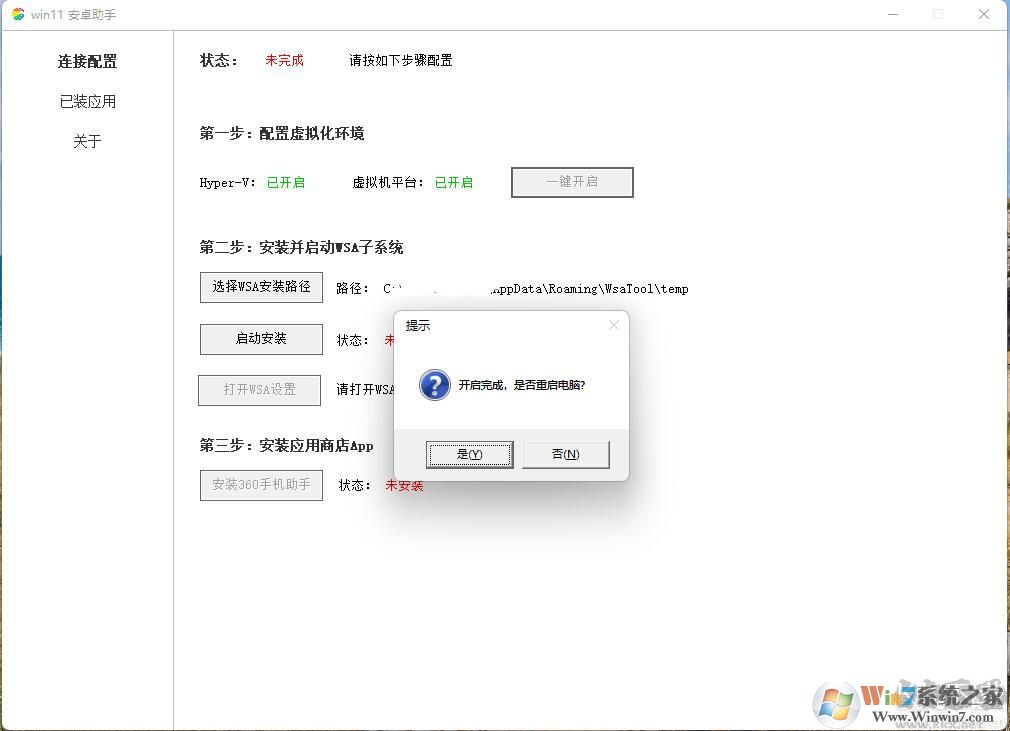 1、打开后点击“一键开启”,等待一会,会提示你重启电脑,点击重启 PS:在这一步家庭版会提示失败,要手动打开Hyper-V才行,大家可以自行百度!
