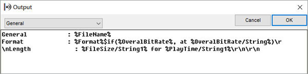 器皿:格式,环境变量,格式的商业名称,延续时间,总视频码率,撰写应用软件和库,文章标题,创作者,电影导演,音乐专辑,曲子序号,日期,延续时间…