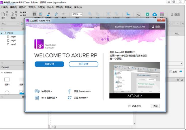 启动 Axure 即可看到简体中文界面, 说明已成功汉化,如果仍为英文则一定是汉化文件位置不正确.