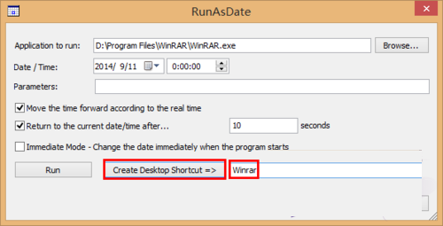 RunAsDate是一款用来破解有时间限制软件的神器,使用简单,可以建立运行在特定日期时间的快捷方式,此实用程序不会改变当前的系统日期和您的计算机的时间,但它只是你注入到指定所需的应用程序的日期/时间。对于一些7天试用,30天试用的软件而言非常的有效!