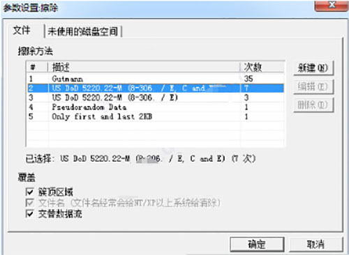 3、参数设置-擦除设置-文件和未使用的磁盘空间中的选项都要选中“2 US DoD 5220.22-M(8-306./E,C and E) 7次”,并点击确定。
