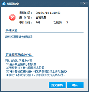 问题原因:累计离线开票金额已经超过税局授权的离线开票累计限额。