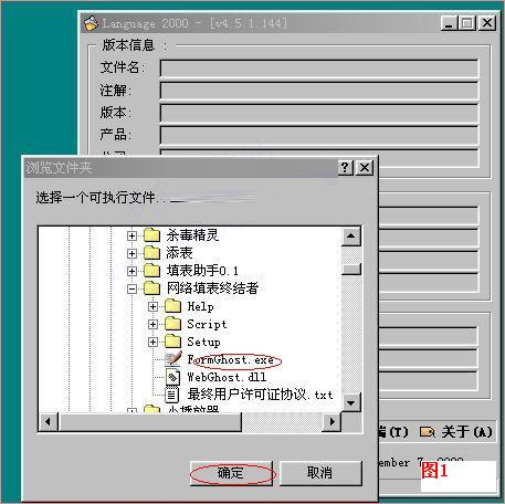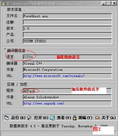 1、侦壳:先打开侦壳 language.exe,选择打开----找到要破解的网络填表终结者:FormGhost.exe,点确定,如图1。language.exe便显示出软件的壳是:Aspack,见winwin7分享的图片:
