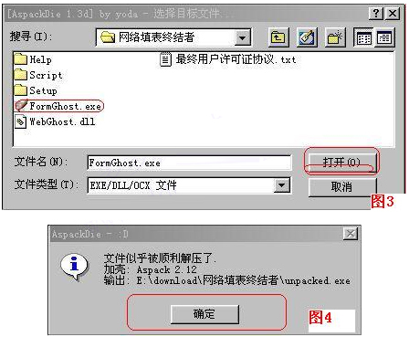 2、脱壳:双击脱壳AspackDie.exe,出现一个对话框,选择网络填表终结者:FormGhost.exe,打开,点确定脱壳完成。在网络填表终结者:FormGhost.exe同目录下生成一个unpacked.exe文件,这就是脱壳后的FormGhost.exe,见winwin7分享的图片: