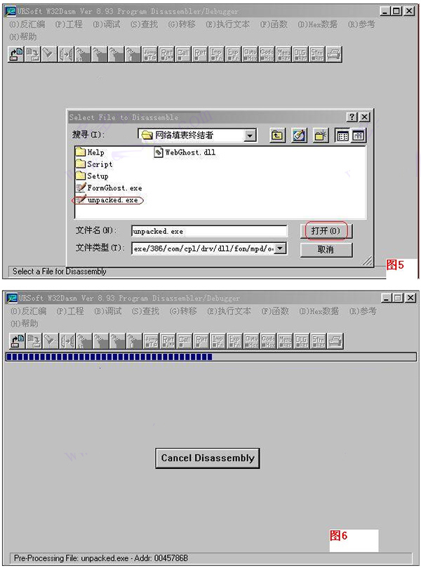 4,开始反汇编:打开 反编译 W32Dasm黄金中文版,选择反汇编----打开脱壳后的unpacked.exe,变开始加载,见winwin7分享的图片: