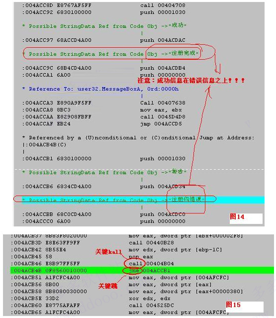 注意:正确注册信息在错误信息之上,关闭串式参考框。看主程序。从注册码错误向上找到第一个跳转(关键跳,除了jmp的其它跳:je,jne,jz,jnz),见winwin7分享的图片: