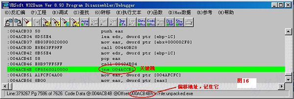 (它上面的call叫关键call。),双击关键跳,看软件最下面有一行字:Line:379267 Pg 7586 of 7626 Code Data@004ACB4B@Offset 00ACB4BH in File:unpacked.exe.其中@Offset 00ACB4BH就是偏移地址,记住00ACB4B(后面的h代表16进制,不用管他),,见winwin7分享的图片: