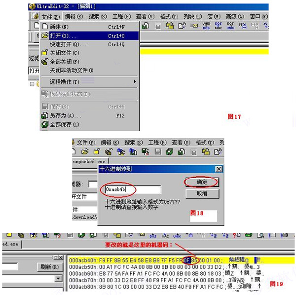 5、开始修改软件:打开16进制编辑器 UltraEdit.rar,(有点慢)。打开脱壳后的unpacked.exe,直接按ctrl+g,出现对话框,输入0xacb4b(即偏移地址,不要前面的000)图18。点确定,,见winwin7分享的图片: