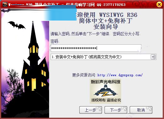 5、在密码框中输入密码(压缩包内打包),并选择“安装中文+免狗补丁”选项
