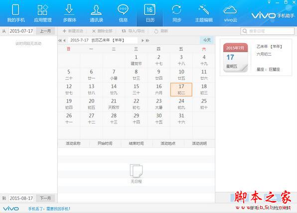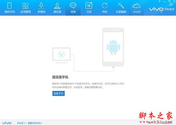 vivo手机助手电脑版是一款适用于电脑上使用的手机助工具,可以通过它来挂历vivo智能手机资料、制作主题及下载手机应用等操作,帮助vivo手机用户将手机和电脑变连接起来,发挥电脑的屏大、速度快、易操作等优势,让你可以更加轻松的管理手机。使用时,仅需要用USB线将手机与电脑连接,在电脑上运行vivo手机助手,即可不断发现惊喜。
